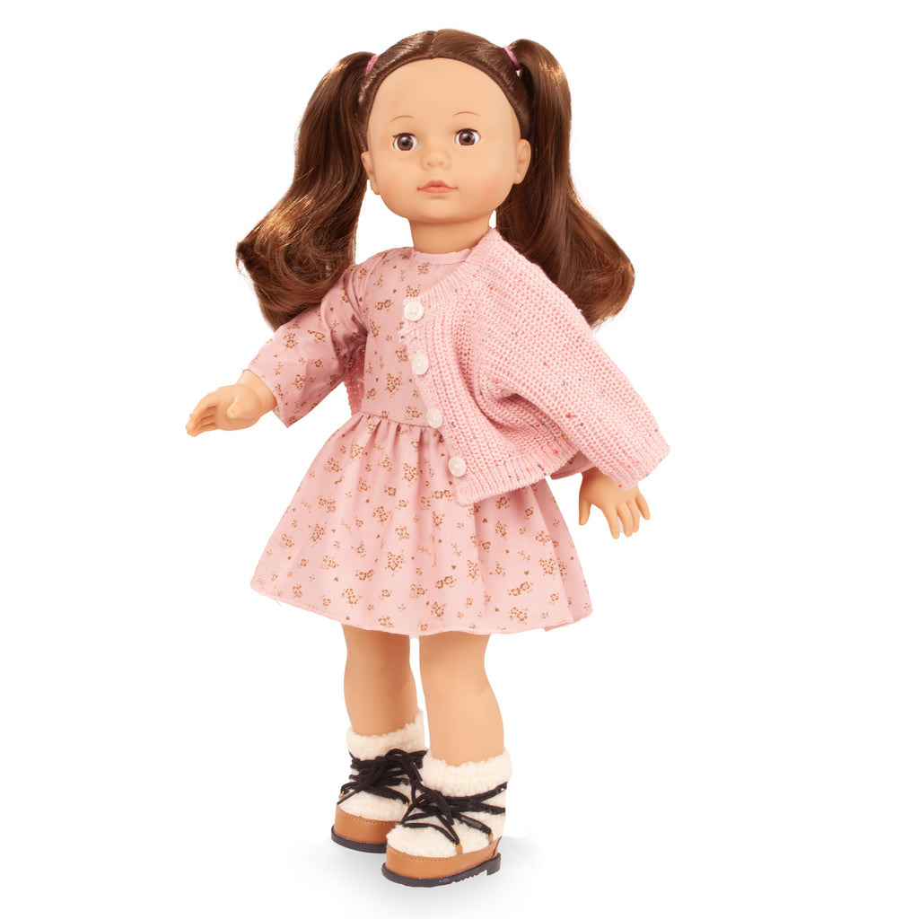 The Precious Day doll Elisabeth has long brown hair, brown sleeping eyes, and wears a dress with ruffles and a floral print, a knitted cardigan, and winter boots. Her articulation allows for lively role-play and encourages imagination and empathy. Elisabeth reliably accompanies children in everyday play, offering a play experience that combines joy and expressive storytelling.
