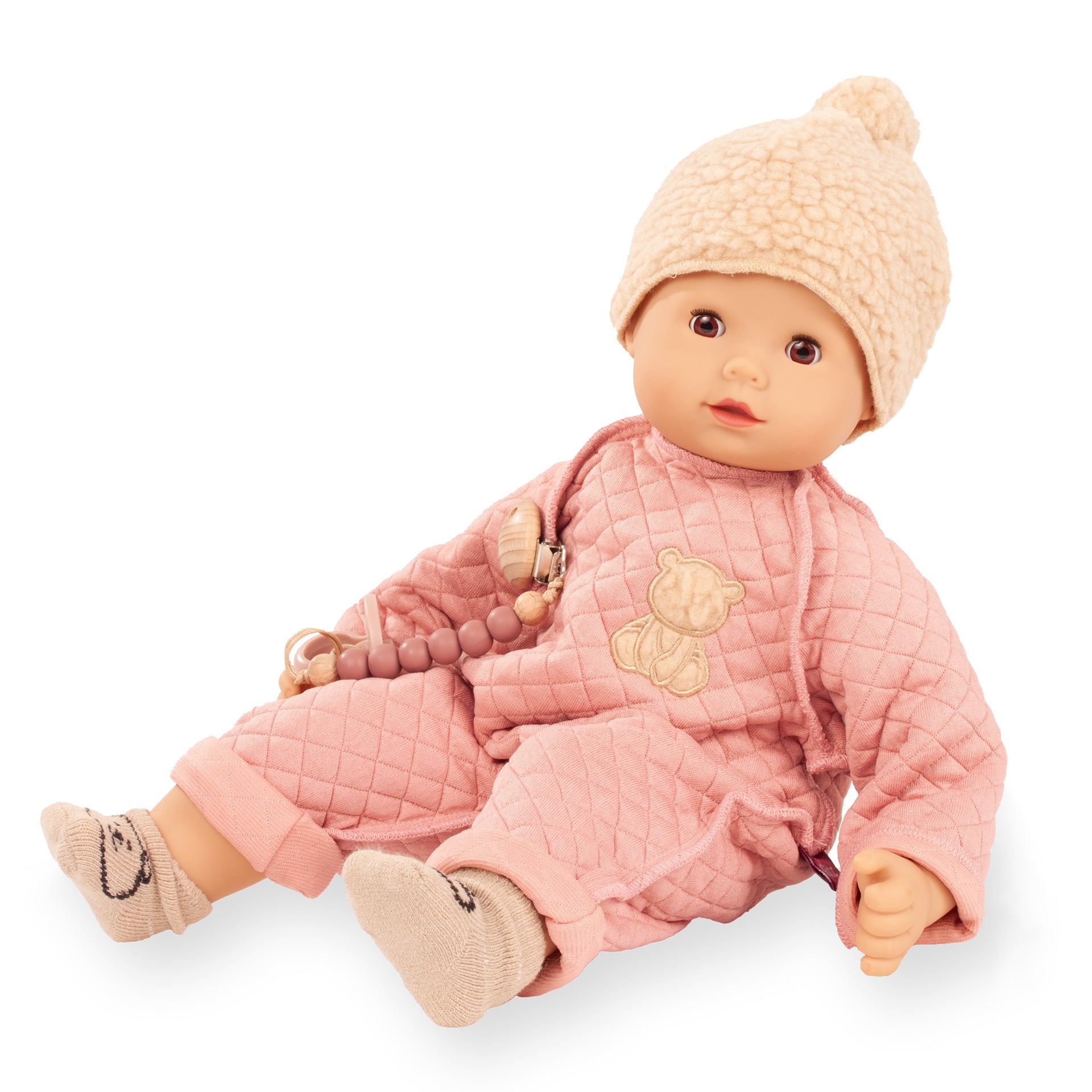 The Maxy Muffin beary Baby Doll combines thoughtful design with high quality. She wears a quilted overall with a delicate plush bear appliqué, complemented by a soft plush hat and matching socks. A pacifier with chain completes the stylish ensemble. With its harmonious design, this doll invites to play while conveying lasting value – a companion that offers both joy and comfort.