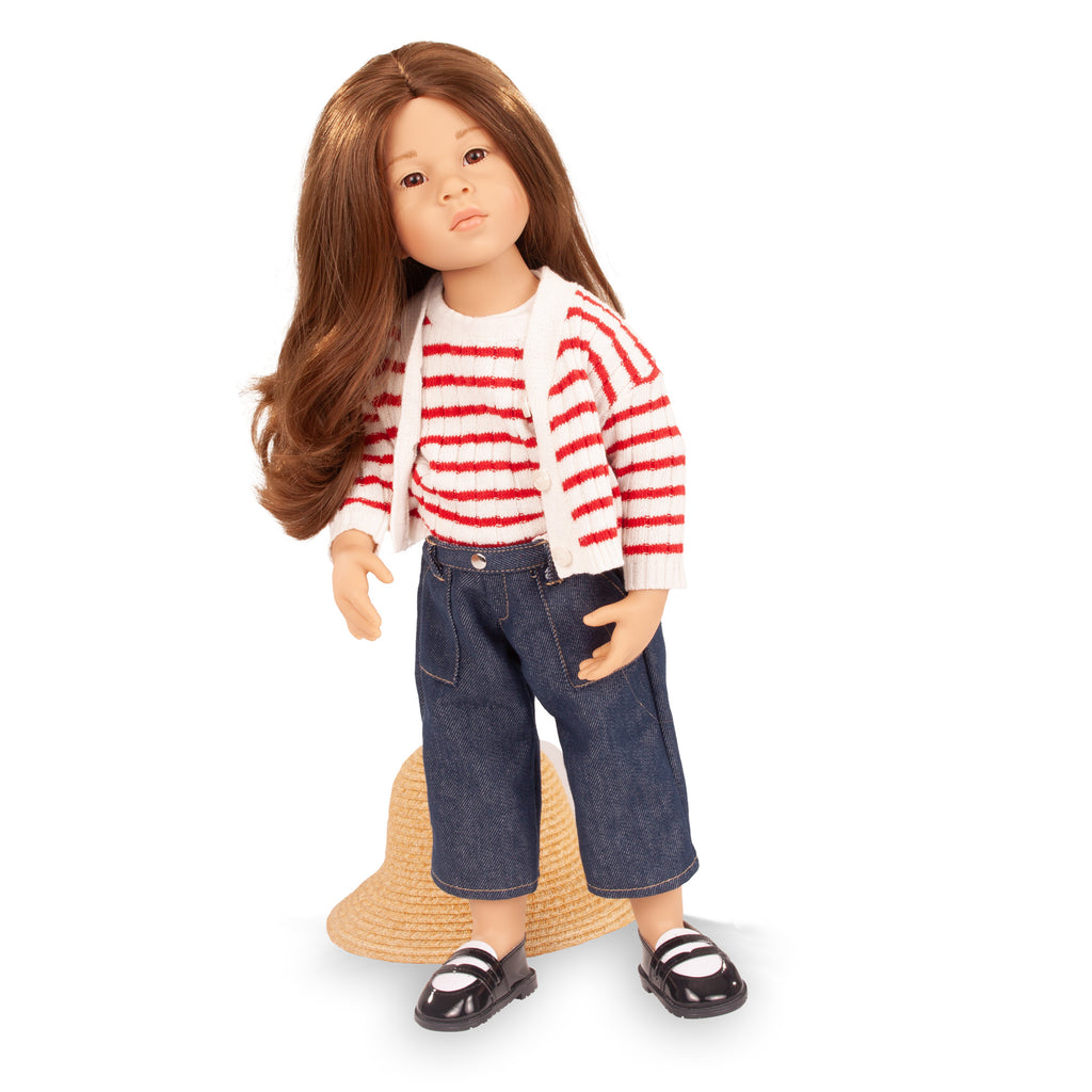 Meet the high-quality standing doll Emilia. She is stylishly dressed in a fine knitted vest with a matching cardigan, carefully crafted jeans, elegant Mary Jane shoes, and a charming hat. Every detail reflects quality and a love for craftsmanship. Emilia is a durable companion, designed to inspire creative play and bring joy simply by being admired.